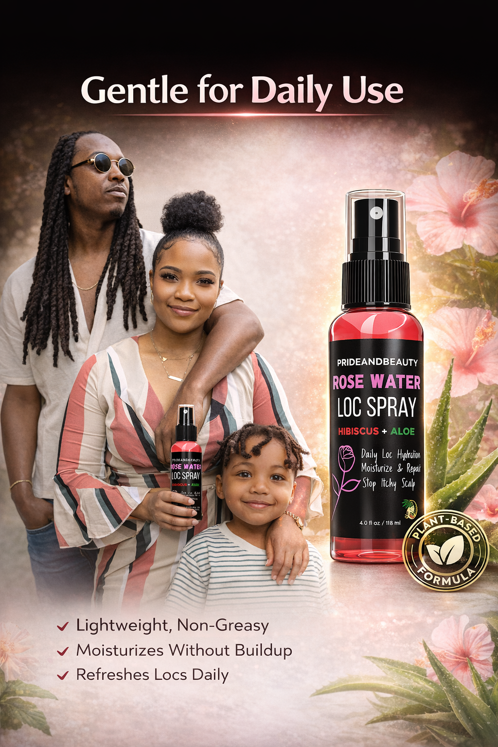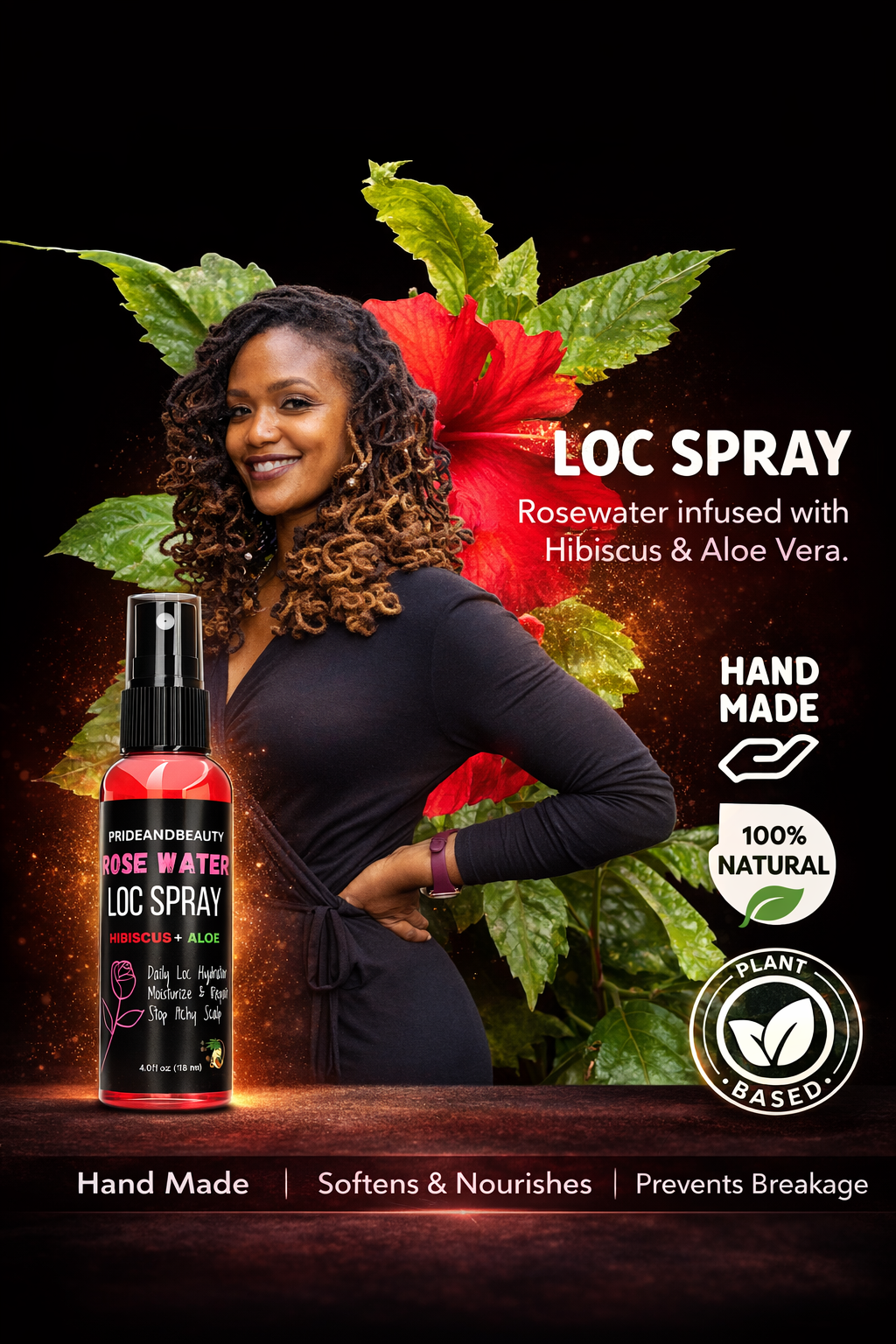 Experience soft, hydrated, and healthy locs with Pride and Beauty Rose Water Loc Spray, a lightweight, plant-based formula designed specifically for textured hair and loc care. Infused with nourishing botanical ingredients like rose water, hibiscus, and aloe vera, this refreshing mist hydrates your scalp and locs without buildup, leaving your hair feeling revitalized, moisturized, and beautifully fragrant.